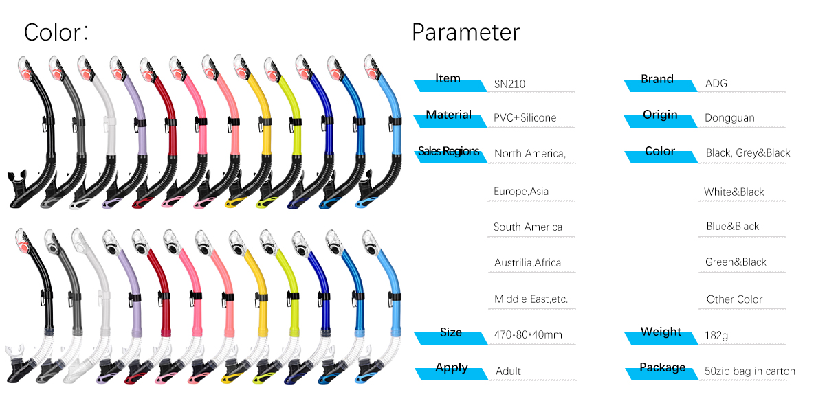 Easily attach to any regular snorkel/dive mask: Quick-release adjustable clip easy to clip on/off a diving mask, allowing movement up and down the snorkel tube, for a comfortable position. Your hair doesn't get tangled as much in this type of attachment between the mask and snorkel. Food-grade liquid silicone mouthpiece: Super soft and safe material for the mouthpiece, very comfortable in your mouth, and provides a good seal. form-fitting with an angled and corrugated mouthpiece design, allowing for prolonged use. It’s a removable and replaceable silicone mouthpiece if necessary. Longer oval upper tube provides more air, and breathe effortlessly: A large diameter tube will give you full breaths without making you struggle to catch your breath. The upper tube is curved and comes close to your head, which will prevent drag your mouth. It’s a perfect snorkel for snorkeling, skin diving, scuba diving, swimming, etc. Easily blow out water through one way purge valve: Sits at the bottom of a bulb-like reservoir that’s offset from the mouthpiece tube, which makes it effortless to clear and bone dry. Water can even be cleared out of the dry snorkel while underwater; all you have to do is give it a good blow. Advanced top dry valve and splash guard: Dry snorkel profiled “paddle” dry top automatically closes when submerged, not allowing water entry. Even when waves crash overhead, the splash-guard will prevent water from coming into the snorkel. Unlike the float ball valve, which gets lodged easily by small sands or kinds of stuff, our new design valve won't be stuck, which gives you comfortable breathing.