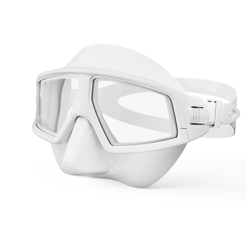 Ultra Low-Volume Design: Perfect for freediving and spearfishing, the mask’s low-volume structure ensures minimal air requirement for ease of mask equalization, essential for deep dives and swift underwater movements. 180° Distortion-Free Panoramic Vision: Enjoy a clear and expansive view with our exclusive Curved Lens Technology, providing distortion-free, panoramic vision that enhances your underwater experience. Advanced Fit Technology (AFT): The double-sealed, professional-grade liquid silicone skirt adapts to various face shapes, offering a flexible, soft, and anti-leak fit that ensures maximum comfort and a watertight seal. Easy Adjustable Buckle System: Adjust the mask quickly and securely with our user-friendly buckle system, designed for optimal fit and stability during extended dives. Innovatively Shaped Strap: The strap is ergonomically designed to form perfectly to the diver’s head, increasing comfort and providing a more secure fit, reducing pressure points, and preventing slippage. Enhanced Nose Pocket: Designed ergonomically to facilitate easy equalization with your fingers, making it simpler to adjust pressure as you dive deeper. What's Included: The Tidal Freedive Mask comes equipped with a secure travel case and additional anti-fog spray so you can confidently travel with your fog-free Tidal Freedive Mask.