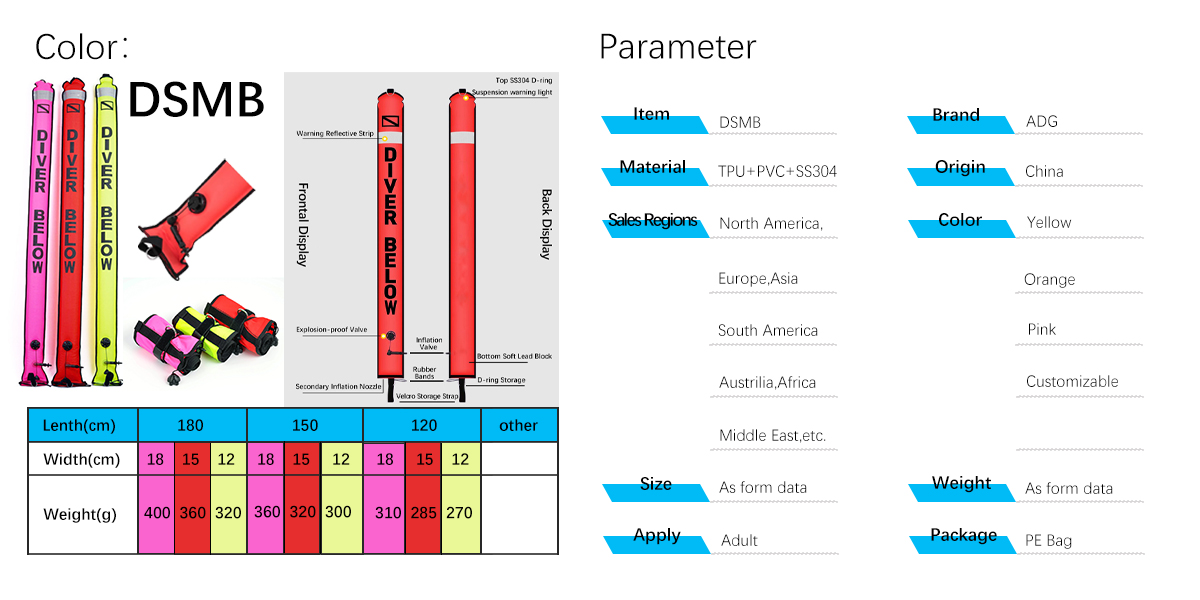 SURFACE MARKER BUOY - The DSMB is an excellent accessory for diving. As a signal tube, the bright color of this buoy is clearly visible at night and at very long distances. In emergency situations, it can also be used as an emergency float to use additional source of buoyancy that will help you remain surfaced. 5/4/3FT SMB - Also named Safety Sausage, made of 210D nylon fabric, Reliable and Rupture Resistant. the "Diver Below" writings on the body and SOLAS reflective tape on both sides for maximum visibility. Simply inflate orally or with your octo regulator through the opening in the bottom, and the over-pressure valve that will avoid over-inflation to protects your SMB. QUICK STORAGE - The SMB is easily to rolls up after deflated, you can easily store the finger spool and bolt snap, then simply attach the SMB to your BCD with the rorating plastic clip. ( Also use the bolt snap to connec the D-ring and BCD). And it is easy to unpack underwater for rapid deployment while diving. DOUBLE-D CLIP - durable and long-lasting, can easily attach to belt or BC. SAFETY SIGNAL DEVICES- This SMB is perfect for cave and wreck diving, scuba diving, traveling diver, snorkeling, photography, and other underwater activities. Whether it's to avoid crowded marinas or flag the boat team where you are located, it is necessary gear for every scuba diver.