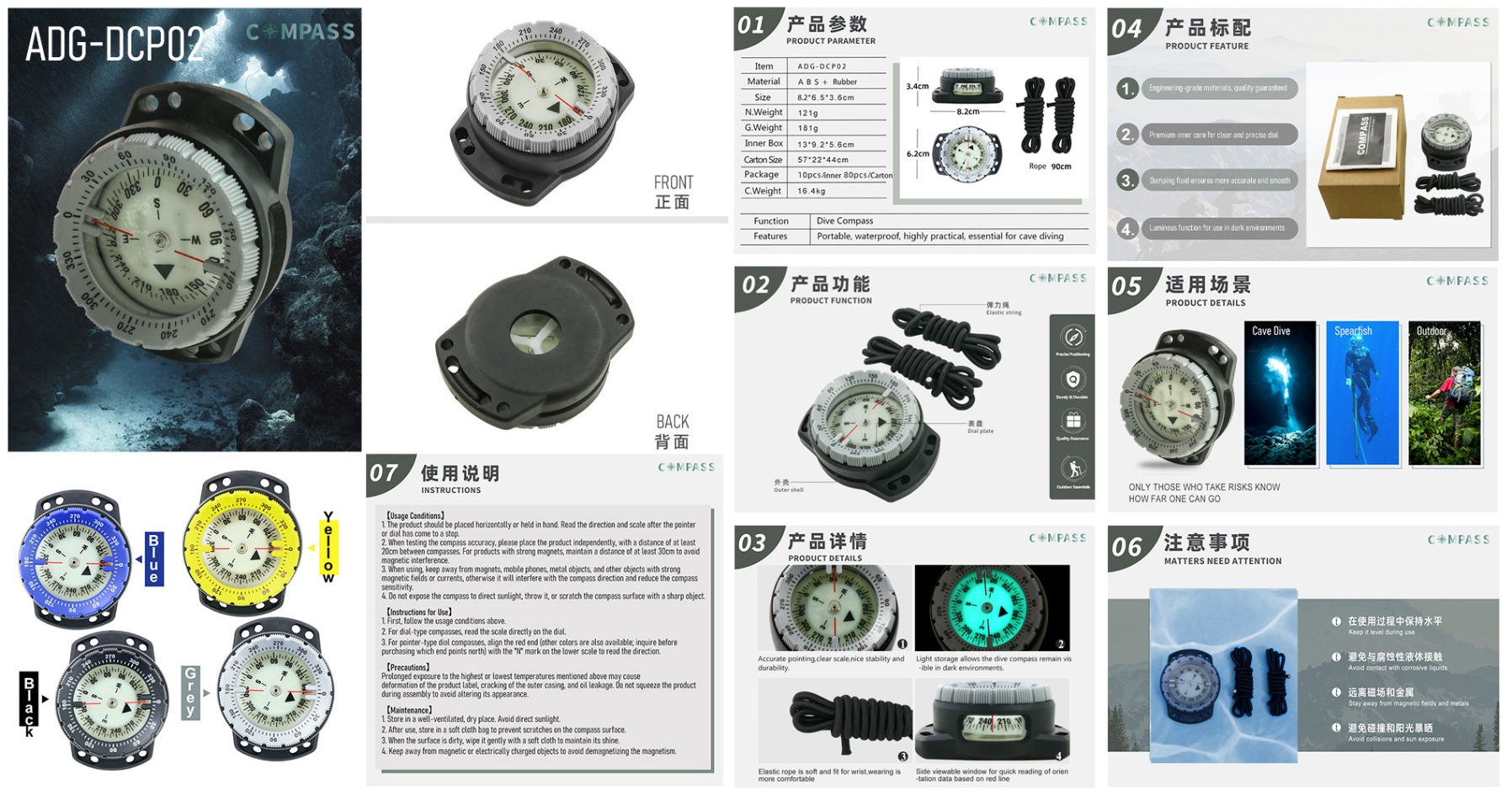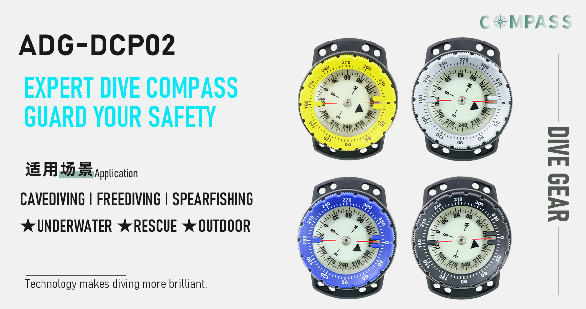 A specialized compass designed for scuba diving, freediving, spearfishing, and cave diving; Professionally waterproof, rated for depths exceeding 50 meters; Constructed using industrial-grade materials for reliable quality; Features damping fluid to ensure stable instrument performance; Equipped with a built-in luminous mode for visibility in dark environments; Available for small-batch orders.