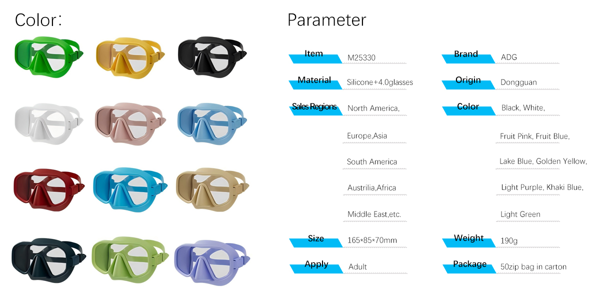 1. Made of food-grade silicone using an integrated molding process; 2. Features a wide-view 4.0 lens with high-definition anti-fog technology; 3. The mask features a double-skirt design for a snug fit and excellent sealing; 4. Designed based on professional facial data collection, suitable for most face shapes; 5. Manufactured by a factory with 26 years of experience in producing diving masks, ensuring stable product quality; 6. Tested by professional diving enthusiasts in tens of thousands of dives.