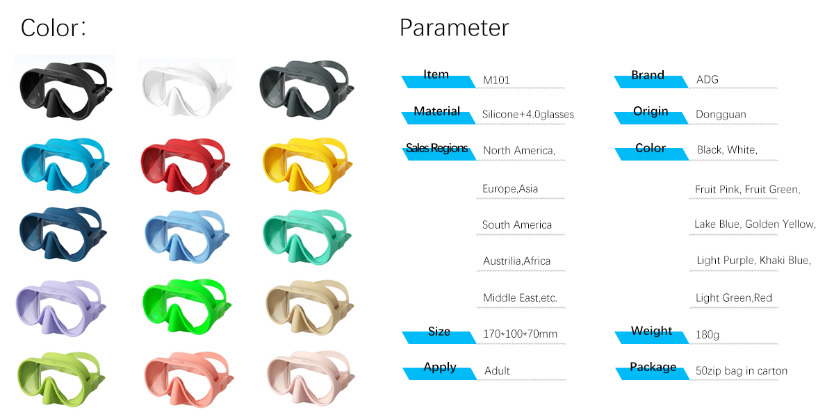 1. Made of food-grade silicone using an integrated molding process; 2. Features a wide-view 4.0 lens with high-definition anti-fog technology; 3. The mask features a double-skirt design for a snug fit and excellent sealing; 4. High-definition, wide-view, one-piece molded, color can be customized; 5. Manufactured by a factory with 26 years of experience in producing diving masks, ensuring stable product quality; 6. Tested by professional diving enthusiasts in tens of thousands of dives.