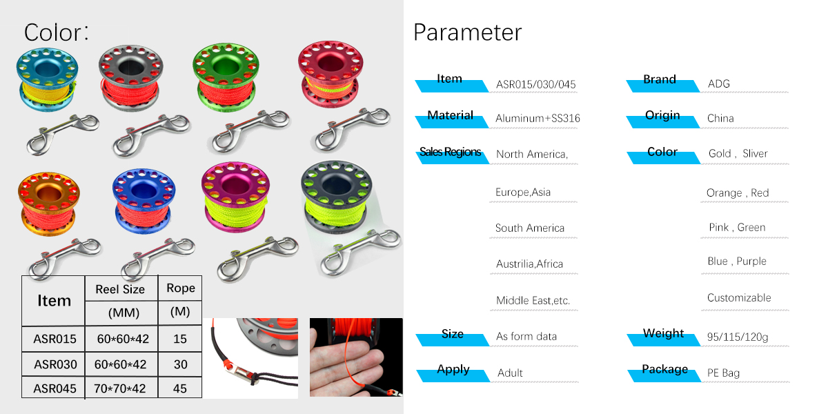 【FINGER SPOOL REEL】The diameter of the dive reel is 1.98/235in, it is made of anodised aluminum alloy material, the spool is smooth to the touch as it spins when letting out line. Inner rounded hole with large diameter center(0.98in)allowing the spool to spin freely between the finger and thumb when deploying line. 【HIGH VISIBILITY LINE】The braided flat nylon line is 50/100/150 feet long with stainless steel swivel connector, can prevent line tangling and twisting well, and high visibility orange color, which is easy to identify to improve underwater visibility. 【DOUBLE-END BOLT】Attached with a stainless steel double ended bolt snap clip, which is strong, reliable and corrosion-resistant, won't hurt your finger. Can fit in BCD pocket or clipped-off to d-ring. 【SCALLOPED EDGES】Lightly scalloped edges of reel provide a secure grip, and concave sides make it easy to wind the line without winding up your fingers, but allows the end of the line to quickly be removed without untying knots. 【WIDELY APPLICATIONS】Important tool for cave and wreck diving exploration, snorkeling, scuba diving, technical diving activities. Also great for spear fishing, kayaking and more a multi-function as a guide accessories.